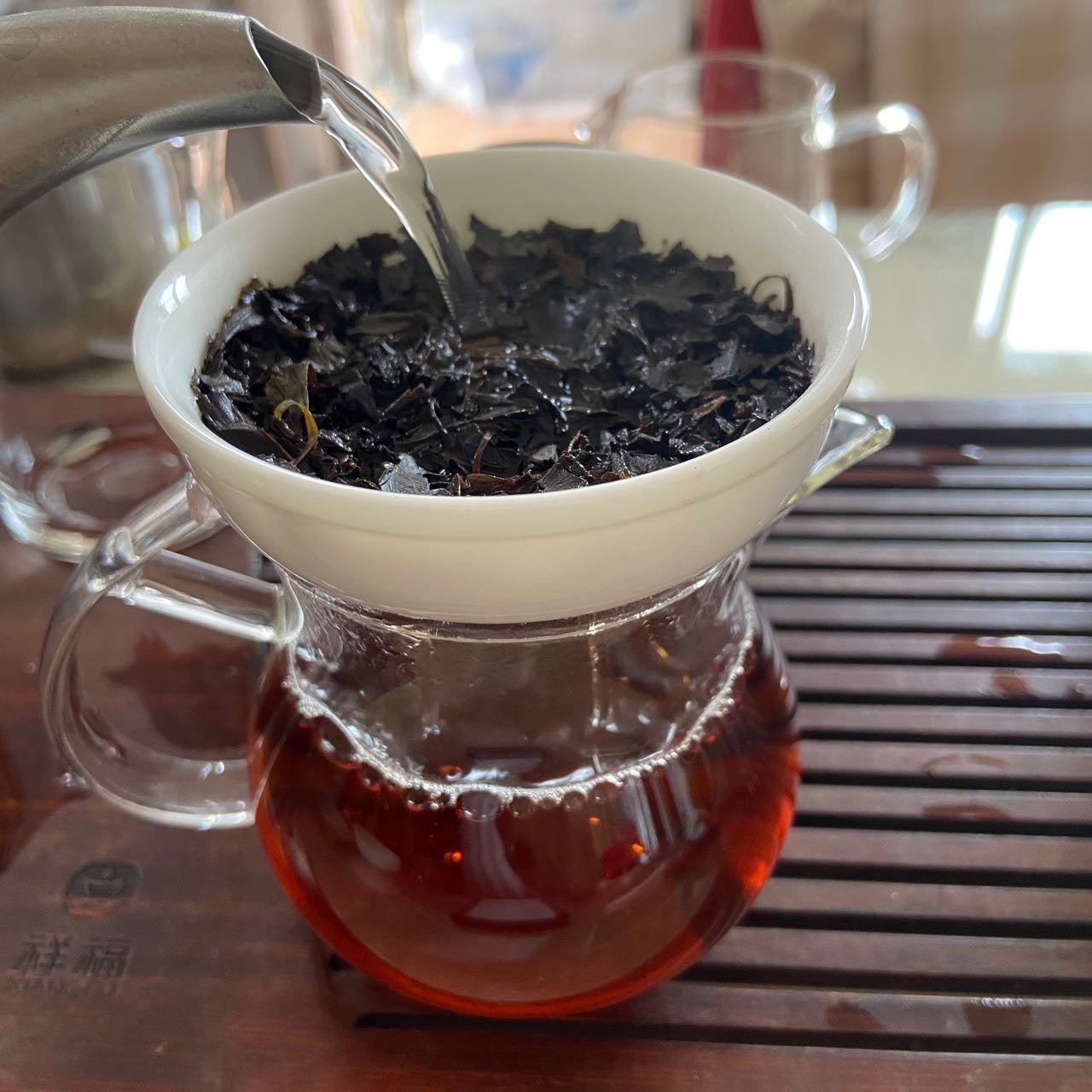 - Rinse the tea leaves by pouring some boiling water over them.